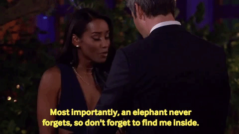 Olivia’s screen time is so brief that the only footage I can salvage a GIF out of (as in, footage without that annoying text overlay) is a 1.2-second shot of the back of her head. Olivia, 23, tells Arie, 36, that she remembers watching him on Emily’s season. I am also 23 and do you know what my memories of watching Emily’s season are? Being a literal high school student and hearing about Emily’s choice between Arie and Jef from my cooler older cousins but not being allowed to watch it myself because my mom thought it was inappropriate for a child of my age.